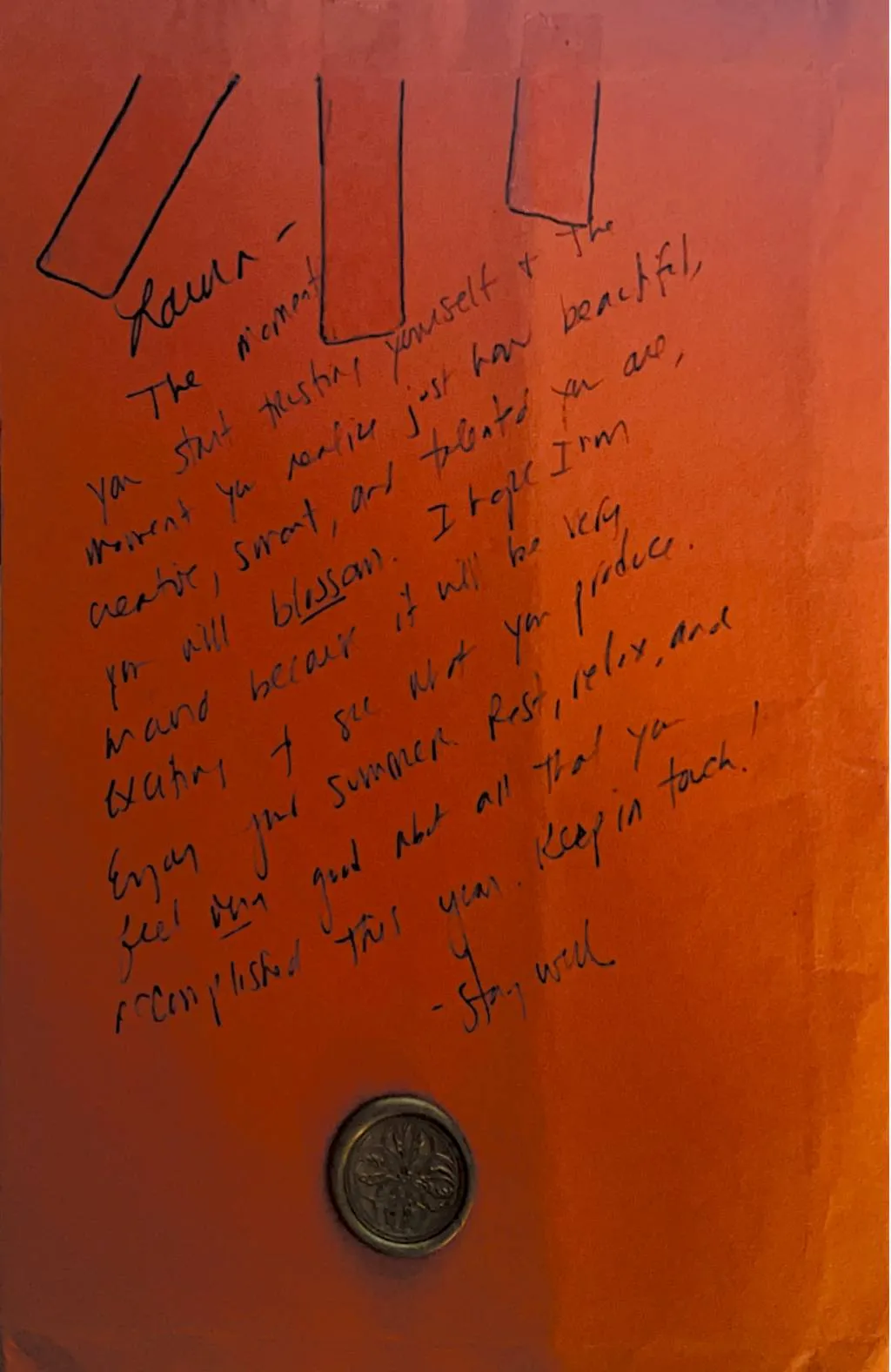 Note from Ms. Fischer wrapping a copy of Sula for me to read over the summer.